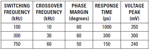 瞬態(tài)響應(yīng)是電源性能級別的一個較好指標。我們利用每種電源的波特圖來表明高開關(guān)頻率的對比情況(參見圖3)。如圖所示,每個電源的相位裕度在45°和55°之間,其表明瞬態(tài)響應(yīng)得到較好的抑制。交叉頻率約為開關(guān)頻率的1/8。使用快速開關(guān)DC/DC轉(zhuǎn)換器時,設(shè)計人員應(yīng)確保電源IC誤差放大器具有足夠的帶寬來支持高交叉頻率。TPS54160誤差放大器的單位增益頻寬一般為2.7 MHz。表5顯示了實際瞬態(tài)響應(yīng)時間以及電壓峰值過沖的相關(guān)值。開關(guān)頻率越高,過沖值便越是更低,原因是更寬的帶寬。