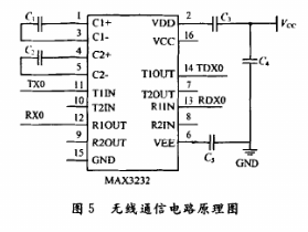 通過串口驅動電路中的RS 232電平轉換芯片,可以實現(xiàn)單片機和PC機之間的通信,建立人-機對話活動的通道。桑銳公司生產的SRWF-1型無線通信模塊工作性能穩(wěn)定,體積小便于安裝。利用MAX3232芯片,能夠完成TTL電平和RS 232電平之間的轉換,實現(xiàn)通信模塊與PC機進行串口通信。其電路原理圖如圖5所示。