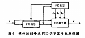 模糊PID控制器的原理是把輸入PID調節(jié)器的偏差e和偏差變化率ec同時輸入到模糊控制器中。圖中的F控制器實際上是由三個分模糊控制器組成的,分別對三個參數(shù)進行調節(jié),然后分別經過模糊化、近似推理和清晰化后,把得出的修正量分別輸入PID調節(jié)器中,對三個系數(shù)進行實時在線修正,從而使被控對象具有良好的動態(tài)和靜態(tài)性能。