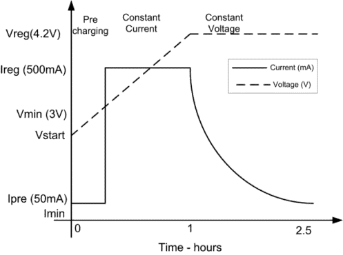 鋰離子電池充電要求對電池實施精確的電流和電壓控制,以確保電池電量充滿,防止縮短電池使用壽命,并防止在充電期間出現(xiàn)危險狀態(tài)。鋰離子電池充電的常見過程(請參見圖 3)可分為如下三個階段:預穩(wěn)壓、恒定電流充電和恒定電壓充電。