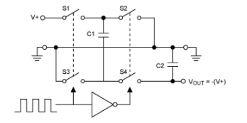 閉合S1和S3會(huì)在前半個(gè)周期將飛跨電容器C1充電至V +。在下半部分,S1和S3打開(kāi),S2和S4關(guān)閉。此動(dòng)作將C1的正極連接到地,并將負(fù)極連接到VOUT。C1然后與儲(chǔ)能電容器C2并聯(lián)。如果C2兩端的電壓小于C1兩端,則電荷從C1流到C2,直到C2兩端的電壓達(dá)到-(V +)。
