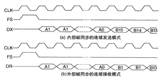 同步串行口有連續(xù)及突發(fā)兩種操作模式,可支持一系列應(yīng)用。在連續(xù)模式下,只需要一個幀同步脈沖就可以連續(xù)發(fā)送或接收多個軟件包?在突發(fā)模式下,在每一個幀同步脈沖之后只允許發(fā)送或接收一個16bit單字。具有內(nèi)部幀同步的連續(xù)發(fā)送時序和具有外部幀同步的連續(xù)接收時序分別如圖1a和圖1b所示。