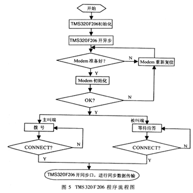 系統(tǒng)工作流程如下:系統(tǒng)上電復(fù)位后,TMS320F206首先進(jìn)行初始化,打開異步口,然后檢測調(diào)制解調(diào)器是否準(zhǔn)備好。若沒準(zhǔn)備好,則對調(diào)制解調(diào)器再次復(fù)位;若準(zhǔn)備好,則送AT命令進(jìn)入調(diào)制解調(diào)器?對調(diào)制解調(diào)器進(jìn)行初始化。即使能調(diào)制解調(diào)器同步口,將調(diào)制解調(diào)器設(shè)置為異步連接同步傳輸方式,采用外部時鐘以及對同步傳輸模式、傳輸速率等相關(guān)特性進(jìn)行設(shè)置。同時決定主叫端是否加上ATX1命令以及被叫端是采用何種應(yīng)答方式。調(diào)制解調(diào)器每次收到正確AT命令且正確進(jìn)行相應(yīng)操作后,會通過異步串口回送OK信號。因此,若TMS320F206收到OK信號,就表明初始化成功。調(diào)制解調(diào)器初始化完成后,主叫端便撥號啟動呼叫,被叫端進(jìn)入自動應(yīng)答或偽自動應(yīng)答過程。連通后,調(diào)制解調(diào)器會回送CONNECT信息給TMS320F206。此后TMS320F206便禁止異步口、打開同步口,開始進(jìn)行同步數(shù)據(jù)傳輸。