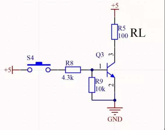 如下圖為PNP型三極管,按下開關(guān)S2,約1mA的Ib流過箭頭,三極管工作在飽和狀態(tài),e極到c極完全導通,c極電平接近5V,負載RL兩端壓降接近5V。