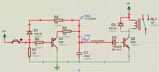 為三極管延時導通,快速關(guān)斷的一個仿真電路,D1、R2、C1、D2構(gòu)成延時導通Q2的回路,C1的電壓為12V的時候Q2導通,R3、Q1、R4、R1構(gòu)成快速關(guān)斷Q2的回路,C1通過R3和Q1快速放電。