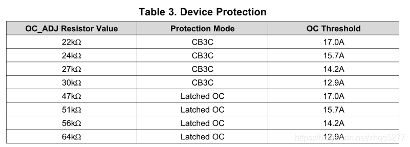2. 確定系統(tǒng)功率,設(shè)計限流閾值: 通過OC_ADJ引腳串聯(lián)電阻設(shè)定:
