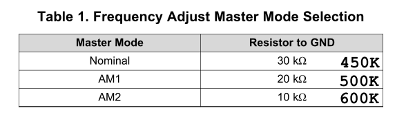 3. 設(shè)計classD 采頻率: 通過FREQ_ADJ引腳串聯(lián)電阻設(shè)定: