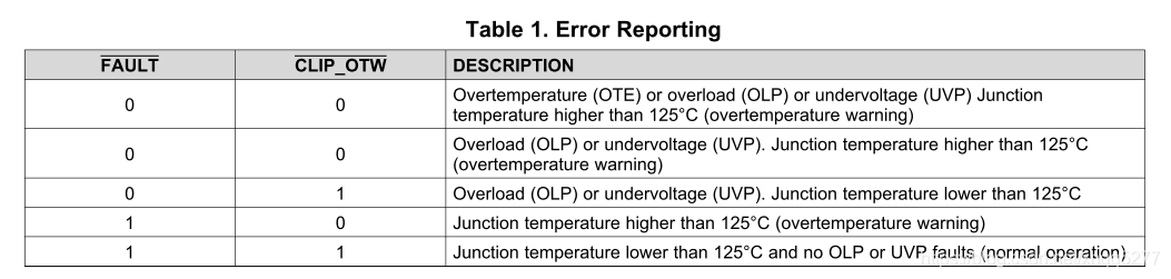 無論什么原因?qū)е碌臒o輸出,F(xiàn)AULT都會是“0”狀態(tài); 當(dāng)結(jié)溫超過125℃時,CLIP_OTW置”0“狀態(tài),如結(jié)溫繼續(xù)上升到155℃時,F(xiàn)AULT置“0”狀態(tài),并關(guān)斷輸出, "OTE"被使能,輸出關(guān)斷鎖定,必須重新復(fù)位才能啟動; 所以一個好的設(shè)計應(yīng)該是這樣:檢測CLIP_OTW的狀態(tài),當(dāng)CLIP_OTW置“0”時,系統(tǒng)相應(yīng)減小音量,以防激活“OTE”