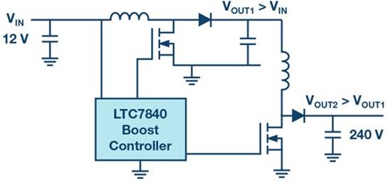 如果應(yīng)用中需要更高的升壓因數(shù),那么兩級式概念也是一種選擇。ADI的新型LTC7840在單芯片中包含兩個升壓控制器,可輕松實(shí)現(xiàn)兩級式升壓概念。圖3顯示了一個從12V電源電壓升壓至240V輸出電壓的例子。兩個升壓級可分步提升電壓,使每yi級僅需將電壓提升4.5倍左右。