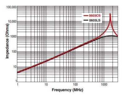 當(dāng)需要阻塞較窄的頻段時,可以使用高Q陶瓷或空氣電感器,如0603CS,如圖1所示,例如手機(jī)上的小信號,低頻通信線路。