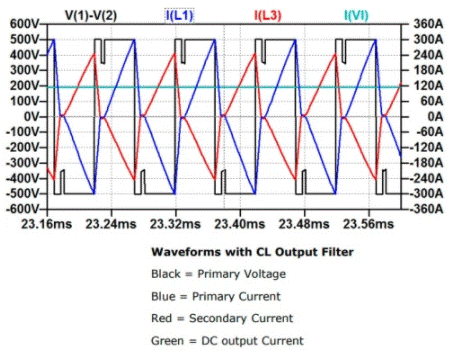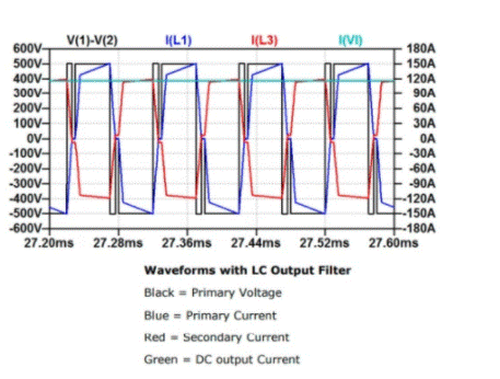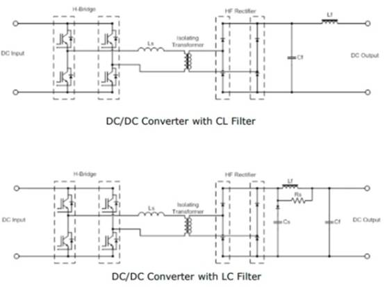 這是本質(zhì)上是隔離的單向轉(zhuǎn)換器。它的初級(jí)繞組借助于單相H橋逆變器來(lái)驅(qū)動(dòng)。直流輸出是通過(guò)全橋整流器產(chǎn)生的,并且為了直流輸出的清潔度需要一個(gè)輸出濾波器,可以是CL或LC。帶有LC和CL濾波器的DC-DC轉(zhuǎn)換器如圖1所示。在CL濾波器的情況下,不需要整流二極管來(lái)整流二極管。由于整流器電流不連續(xù),H橋中的電流波形為三角形。較高的電流峰值導(dǎo)致三角波形效率低下。如圖2所示,在400直流輸出和500直流輸入下有120A電流充電。使用LC輸出濾波器會(huì)產(chǎn)生連續(xù)電流,該連續(xù)電流會(huì)在H橋中產(chǎn)生具有低電流峰值的方波。與使用LC濾波器有關(guān)的另一個(gè)優(yōu)勢(shì)是效率高[1]。LC濾波器的波形如圖3所示。