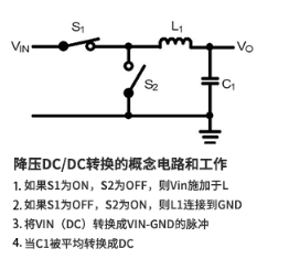 降壓DC/DC轉(zhuǎn)換是借著開(kāi)關(guān)將DC電壓VIN做時(shí)間分割后以電感和電容器使其平滑化來(lái)轉(zhuǎn)換成所希望的DC電壓。降壓DC/DC轉(zhuǎn)換的概念電路和工作如右所示。
