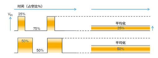 以PWM工作來(lái)說(shuō)明,以S1=ON/S2=OFF將VIN供電時(shí)間設(shè)為25%、以S1=OFF/S2=ON將0V(GND)狀態(tài)設(shè)為75%的脈沖周期,當(dāng)該脈沖平均化時(shí)將為25%的DC。如果VIN為10V,則Vo將為25%的2.5V。
