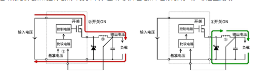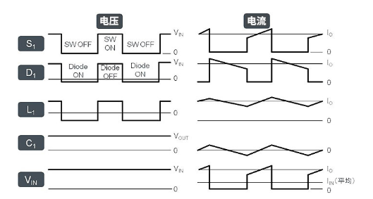 與基準(zhǔn)電壓進(jìn)行比較,檢查輸出電壓是否為設(shè)定電壓低于設(shè)定電壓時(shí),開(kāi)關(guān)變?yōu)镺N,從輸入向輸出供電。此時(shí),電感會(huì)蓄積磁能,如果輸出電壓高于設(shè)定電壓,則開(kāi)關(guān)OFF電感所蓄積的磁能變?yōu)殡娏鞅还┩敵鲐?fù)載,再返回電感電感的磁能消失,輸出電壓開(kāi)始下降時(shí),開(kāi)關(guān)會(huì)再度為ON實(shí)際電流及電壓的開(kāi)關(guān)波形也有記載。S1為MOSFET的開(kāi)關(guān)晶體管、D1為肖特基二極管、L1為電感、C1為輸出電壓、VIN為輸入電壓。