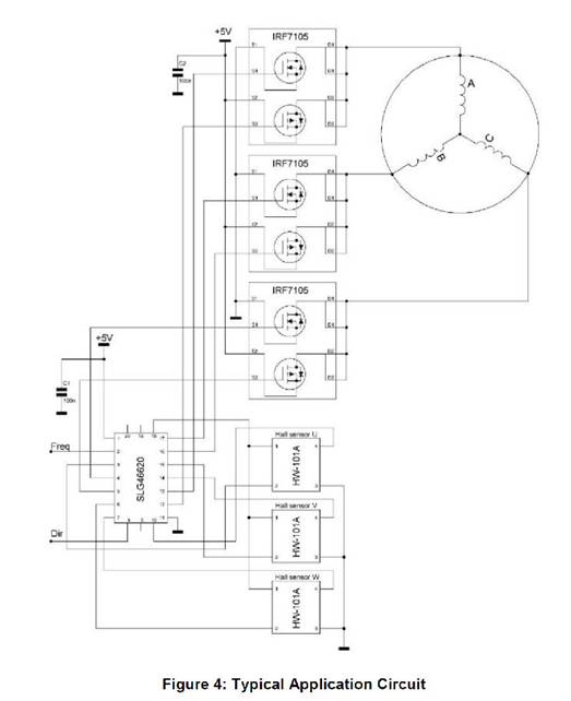 該項(xiàng)目描述了如何使用SLG46620 GreenPAK IC和霍爾效應(yīng)傳感器控制三相無(wú)刷直流電機(jī)。SLG46620 還包含可用于該項(xiàng)目的其他功能。例如,GreenPAK 中的 ADC 可以解釋輸入直流電壓并根據(jù)該值生成 PWM 脈沖,而不是使用輸入頻率。