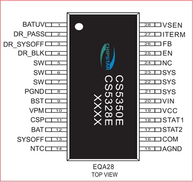 CS5328 CS5328E是一款24V耐壓,異步降壓型鉛酸電池充電管理IC。集成功 率MOS,具有最大5A的充電電流能力,充電電流可以通過外部電阻靈活可調(diào)。 EQA-28 3.6V-24V 具有太陽能板最大功率點跟蹤功能,低功耗運輸模式,電源路徑管理,