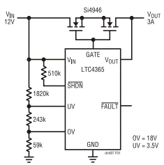 圖 1 示出了一款完整的應(yīng)用電路。一個阻性分壓器負責(zé)設(shè)定用于負載與VIN連接 / 斷接的過壓(OV)和欠壓 (UV) 跳變點。如果輸入電源漂移至該電壓窗口之外,則LTC4365 將迅速把負載與電源斷接。