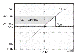 圖 2 示出了圖 1 電路中的 VIN 從 –30V 緩慢斜坡上升至 30V 時做出的反應(yīng)。UV 和 OV 門限被分別設(shè)定為 3.5V 和 18V。當(dāng)電源電壓位于 3.5V 至 18V 窗口之內(nèi)時, VOUT 跟隨 VIN。若超出該窗口時,LTC4365 將 關(guān)斷 N 溝道 MOSFET,并使 VOUT 與 VIN 斷接,即使在VIN為負值的情況下也不例外。