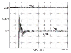 圖 3 示出了當(dāng) VIN 帶電插入至 –20V 時出現(xiàn)的狀況。在連接的前一刻,VIN、VOUT 和 GATE 以地電位為起始點。由于 VIN 和 GATE 連接線的寄生電感之原因,VIN 和 GATE 引腳上的電壓將顯著地變至 –20V 以下。外部 MOSFET 必須具有一個可安全承受該過 沖的擊穿電壓指標。