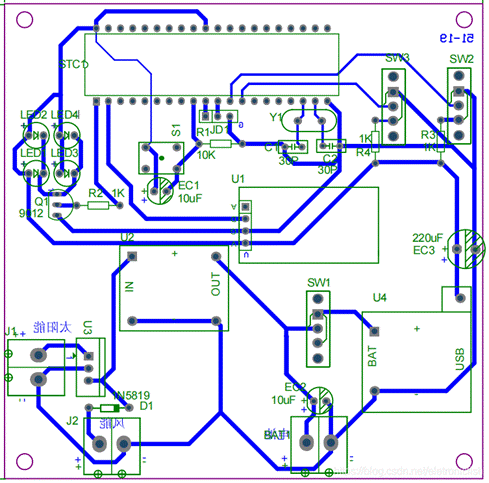 (1)采用風(fēng)機(jī)和太陽能電池板給鋰電池充電,具有充電保護(hù)電路和穩(wěn)壓電路。