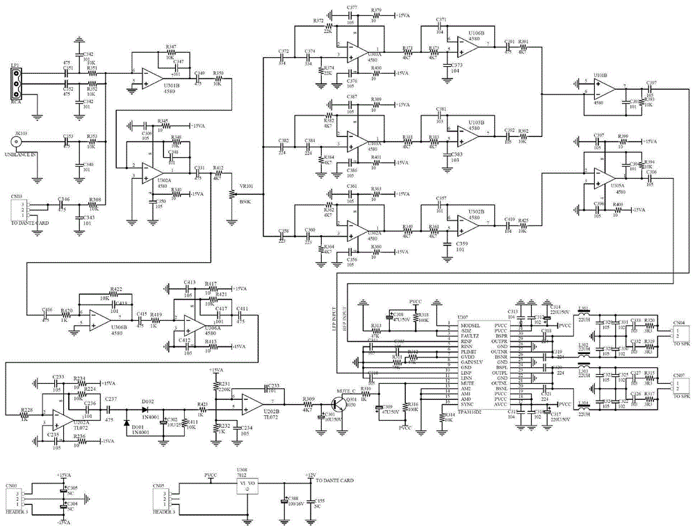 所述運(yùn)放u306b的正相輸入引腳5接地,反相輸入引腳6通過串聯(lián)的電阻r420和電容c416接音頻輸入電路的輸出端,并通過并聯(lián)的電阻r422和電容c418接運(yùn)放u306b的輸出引腳7,所述運(yùn)放u306b的輸出引腳7通過串聯(lián)的電容c415和電阻r419接運(yùn)放u306a的反相輸入引腳2,