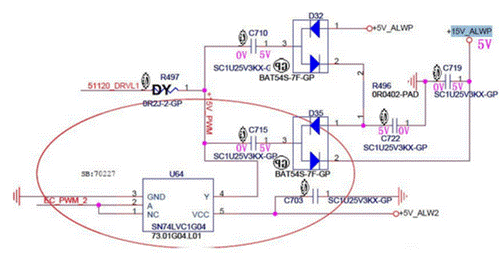 2.同時,Y輸出的5V也對C710進(jìn)行充電,C710兩端的電壓為左邊5V,右邊為10V,然后電流經(jīng)過D32的2引腳對C722進(jìn)行充電,充完電后C722的電壓升到了10V。