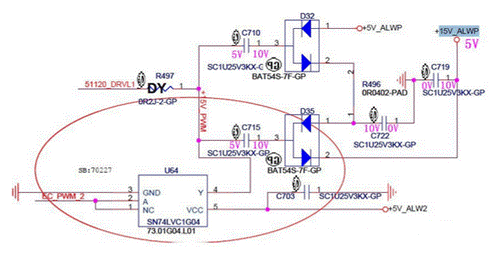 當(dāng)通電時,右上角 5V_ALWP通過D32的1引腳對C710、C722、C715、C719進(jìn)行充電,此時電容上兩端的電位如上圖所示。此時 15V_ALWP輸出端口的實(shí)際電平為5V。