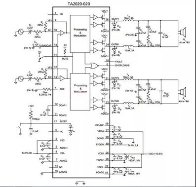 上圖是TA2020的內(nèi)部模塊構(gòu)造,從上圖上可以看出,該芯片內(nèi)部主要集中了處理和調(diào)制模塊,從而實(shí)現(xiàn)高品質(zhì)音頻的特性。