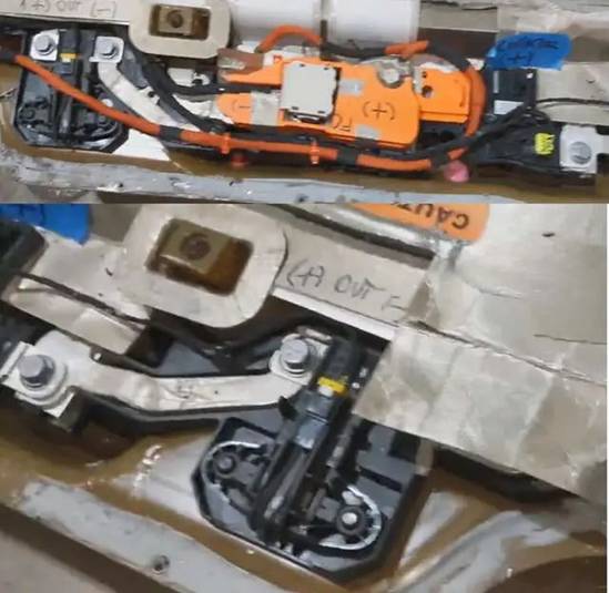 接觸器的組合:主正、主負(fù)和兩個(gè)雙胞胎的快充接觸器,放在了電池系統(tǒng)的后部,設(shè)計(jì)了維修窗口,從座椅下方進(jìn)行處理。