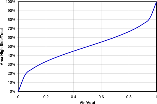 通過圖 1,我們知道 50% 轉(zhuǎn)換比率時(shí)出現(xiàn)最佳傳導(dǎo)損耗極值。但是,在其他轉(zhuǎn)換比率條件下,可以將損耗降至這一水平以下。附錄 1 給出了進(jìn)行這種優(yōu)化的數(shù)學(xué)計(jì)算方法,而圖 2 顯示了其計(jì)算結(jié)果。即使在極低的轉(zhuǎn)換比率條件下,F(xiàn)ET 芯片面積的很大一部分都應(yīng)該用于高側(cè) FET。高轉(zhuǎn)換比率時(shí)同樣如此;應(yīng)該有很大一部分面積用于低側(cè)。這些結(jié)果是對這一問題的初步研究,其并未包括如高側(cè)和低側(cè)FET之間的各種具體電阻值,開關(guān)速度的影響,或者對這種芯片面積進(jìn)行封裝相關(guān)的成本和電阻等諸多方面。但是,它為確定 FET 之間的電阻比提供了一個(gè)良好的開端,并且應(yīng)會在FET選擇方面實(shí)現(xiàn)更好的整體折中。