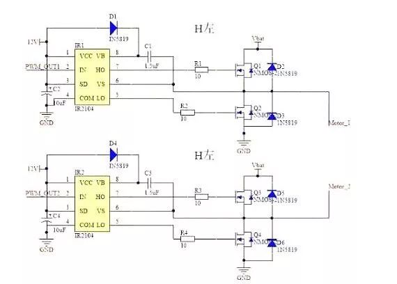 實踐驅(qū)動電路中通常要用硬件電路便當?shù)乜刂崎_關(guān),電機驅(qū)動板主要采用兩種驅(qū)動芯片,一種是全橋驅(qū)動HIP4082,一種是半橋驅(qū)動IR2104,半橋電路是兩個MOS管組成的振蕩,全橋電路是四個MOS管組成的振蕩。其中,IR2104型半橋驅(qū)動芯片能夠驅(qū)動高端和低端兩個N溝道MOSFET,能提供較大的柵極驅(qū)動電流,并具有硬件死區(qū)、硬件防同臂導(dǎo)通等功用。運用兩片IR2104型半橋驅(qū)動芯片能夠組成完好的直流電機H橋式驅(qū)動電路,而且IR2104價錢低廉,功用完善,輸出功率相對HIP4082較低,此計劃采用較多。
