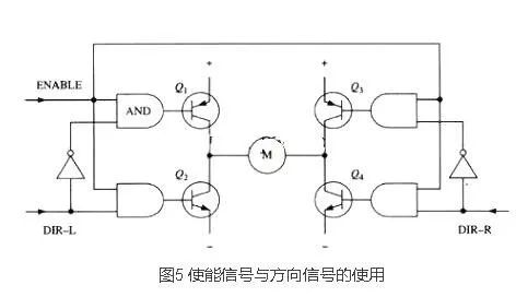 改良電路在根本H橋電路的根底上增加了4個與門和2個非門。4個與門同一個“使能”導(dǎo)通訊號相接,這樣,用這一個信號就能控制整個電路的開關(guān)。而2個非門經(jīng)過提供一種方向輸人,能夠保證任何時分在H橋的同側(cè)腿上都只要一個三極管能導(dǎo)通。(與本節(jié)前面的表示圖一樣,圖4所示也不是一個完好的電路圖,特別是圖中與門和三極管直接銜接是不能正常工作的)