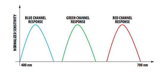各個(gè)紅色,綠色和藍(lán)色通道的光譜響應(yīng)應(yīng)重疊,以確保捕獲所有波長(zhǎng)信息。下面的圖1和圖2分別顯示了重疊和不重疊的頻譜響應(yīng)。圖3顯示了從藍(lán)色表面反射的信號(hào)的任意光譜。 |