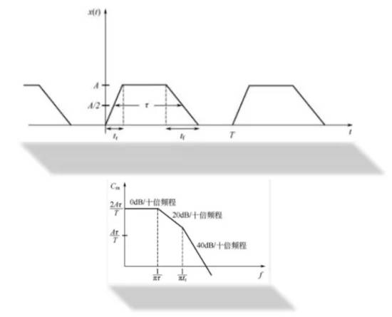 下圖為梯形脈沖波形的時(shí)域波形和頻譜包絡(luò)線;A=幅度,tr=上升沿時(shí)間,τ=平均寬度。從圖中可以看出上升時(shí)間對于高頻諧波存在的影響。可見在EMC設(shè)計(jì)中,著重關(guān)注快速上升沿信號是有充分的理由的,而且?guī)缀跛嘘P(guān)于干擾發(fā)射的測試中,快速上升沿信號,都是最主要因素。那是否只需要處理這類信號就行了呢。由于EMC測試中還有抗擾度項(xiàng)目,所以對慢速信號的處理也需要處理。