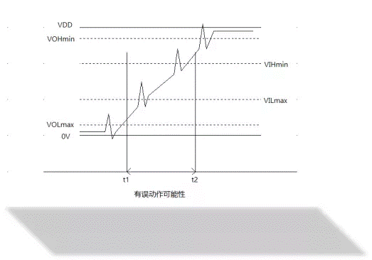 因?yàn)閿?shù)字信號緩慢上升或下降時(shí),。如下圖所示,由于t1-t2的上升時(shí)間變緩,就降低了噪聲容限,出現(xiàn)誤動(dòng)作的可能性大大增加。信號在變化的中段,特別時(shí)閾值附近(VILmax-VIHmin附近)的噪聲容限最低,因此在信號上疊加的噪聲即使很小也會造成誤動(dòng)作。