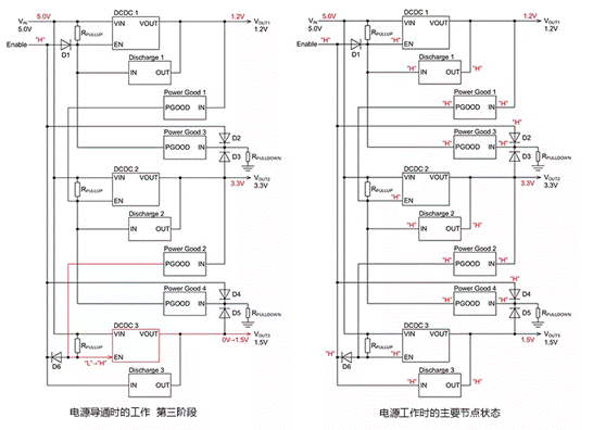 2) DCDC 3的輸出電壓從0V上升到1.5V,至此,三個系統(tǒng)的電源均處于工作狀態(tài)(電源工作時的主要節(jié)點狀態(tài)見單獨給出的圖示)。