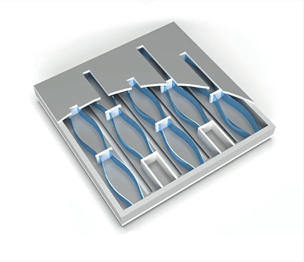 微型揚聲器的內(nèi)部是一個微小的柔性光束陣列,每個光束的長度只有20微米。當(dāng)音頻信號的電壓被施加到該設(shè)備上時,它使這些光束反復(fù)向彼此彎曲。當(dāng)它們這樣做時,它們迫使空氣從設(shè)備的頂部和底部的小開口中流出。被抽出的空氣在耳朵里產(chǎn)生壓力波動,被感知為聲音。