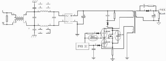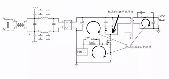 由1-1和1-2式可知,寄生電感和di/dt形成電壓尖峰,寄生電容和dv/dt形成電流尖峰。這些快速變化的電流和關(guān)聯(lián)的諧波在其他地方產(chǎn)生耦合的噪聲電壓,因此影響到開關(guān)電源EMI特性。下面以反激式開關(guān)拓撲為例,對降低MOSFET的dv/dt和di/dt措施進行介紹。