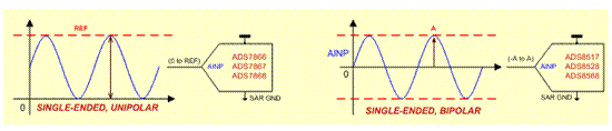 盡管大部分單端 SAR ADC 都可處理單極性信號(hào),但一部分可用于處理幅值 (A) 可輕松超過(guò)電源的雙極性信號(hào)。有些支持一個(gè)通道,有些則支持多個(gè)通道。使用單端 ADC 輸入的一個(gè)常見應(yīng)用是電源電壓監(jiān)控。