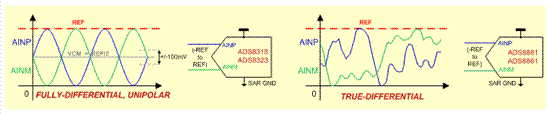 全差分 SAR ADC 支持雙極性輸入和/或多個(gè)通道,與單端 SAR ADC 類似。使用變壓器輸出的應(yīng)用可采用全差分輸入 SAR。 |