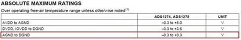 圖3:適用于ADS1278 AGND和DGND的絕對最大額定值