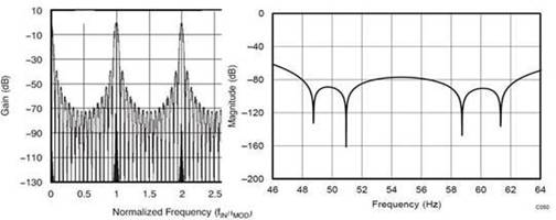 圖4:Sinc 3濾波器響應(yīng)在ADS1298中的輸出頻率達4 × fMOD(a),同時在ADS1220中的抑制頻率為50Hz和60Hz(b)