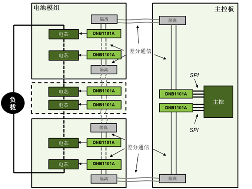 DNB1101A為每個(gè)單獨(dú)的電芯或并聯(lián)的一組電芯提供多種傳感功能,包括電壓監(jiān)測(cè)、溫度監(jiān)測(cè)和電化學(xué)阻抗譜(EIS)監(jiān)測(cè)。通過差分菊花鏈,電池參數(shù)信息被傳輸?shù)诫姵亟M控制器。鏈中的第一顆芯片將標(biāo)準(zhǔn)SPI信號(hào)轉(zhuǎn)換為菊花鏈差分信號(hào),反之亦然。芯片支持環(huán)形通信架構(gòu)。