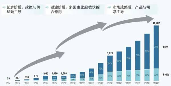 圖1:中國(guó)新能源乘用車銷量預(yù)測(cè)(單位:千臺(tái)),圖中BEV表示純電動(dòng)、PHEV為插電混動(dòng)(圖源:羅蘭貝格)