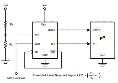通常來講,受到連接到主電源的分壓器的驅動,電源失效比較器指示電源不斷下降。在主電源電壓下降到低于復位閾值之前,PFI的電壓低于VPFT幾毫秒,其會提前發(fā)出欠壓警報。 PFI引腳還可連接到MR引腳,以強制用于電壓檢測器的低輸出信號或用于監(jiān)控器/復位IC的復位。