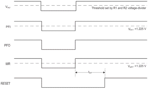 圖4中的時序圖所示為監(jiān)控第二電壓輸入(VIN2)的示例。當連接到PFI引腳的VIN2變?yōu)榈碗娖綍r,PFO引腳下降為低電平,導致MR引腳下降到低電平,然后觸發(fā)復位。有多種方法可以使用電源故障和手動復位功能,因此可由您來決定您的應用需求。