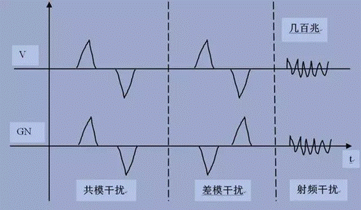 經(jīng)常在實(shí)際操作中,對(duì)系統(tǒng)損傷很大的都是低頻的共模干擾,譬如大功率電機(jī)、斷路器或開關(guān),短路,雷擊感應(yīng)等。這些類型大都是外來(lái)的共模信號(hào),其脈寬在數(shù)百us到s之間,周期很長(zhǎng)也是數(shù)秒,這樣的脈沖持續(xù)引起對(duì)地的高電壓波動(dòng),從而損傷系統(tǒng)。但是對(duì)于高頻共模干擾,從干擾源開始,大部分能量是以輻射的方式作為能量傳輸途徑的,而且這樣的共模干擾多產(chǎn)生于系統(tǒng)本身。