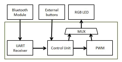 GreenPAK IC將是該項(xiàng)目的控制核心:它從藍(lán)牙模塊和/或外部按鈕接收數(shù)據(jù),然后開始所需的程序來顯示正確的照明。它還生成PWM信號(hào)并將其輸出到LED。下面的圖1展示了功能框圖。
