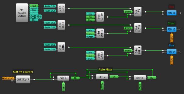 如果禁用手動(dòng)模式并開啟自動(dòng)混合模式,則顏色每500毫秒改變一次,上升沿來自CNT7。4-bit LUT1 用于防止D0 D1 D2處于“000”狀態(tài),因?yàn)樵摖顟B(tài)會(huì)導(dǎo)致燈在自動(dòng)混合模式時(shí)關(guān)閉。