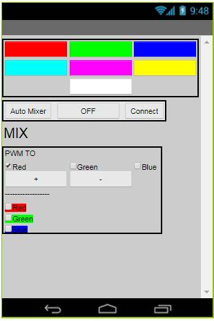 在本節(jié)中,我們將創(chuàng)建一個(gè)安卓應(yīng)用程序,它將監(jiān)測和顯示用戶的控件選擇。界面由兩部分組成:第一部分包含一組具有預(yù)定義顏色的按鈕,因此當(dāng)按下這些按鈕中的任意一個(gè)時(shí),相應(yīng)顏色的LED會(huì)亮起。第二部分(MIX方塊)為用戶創(chuàng)建混合顏色。
